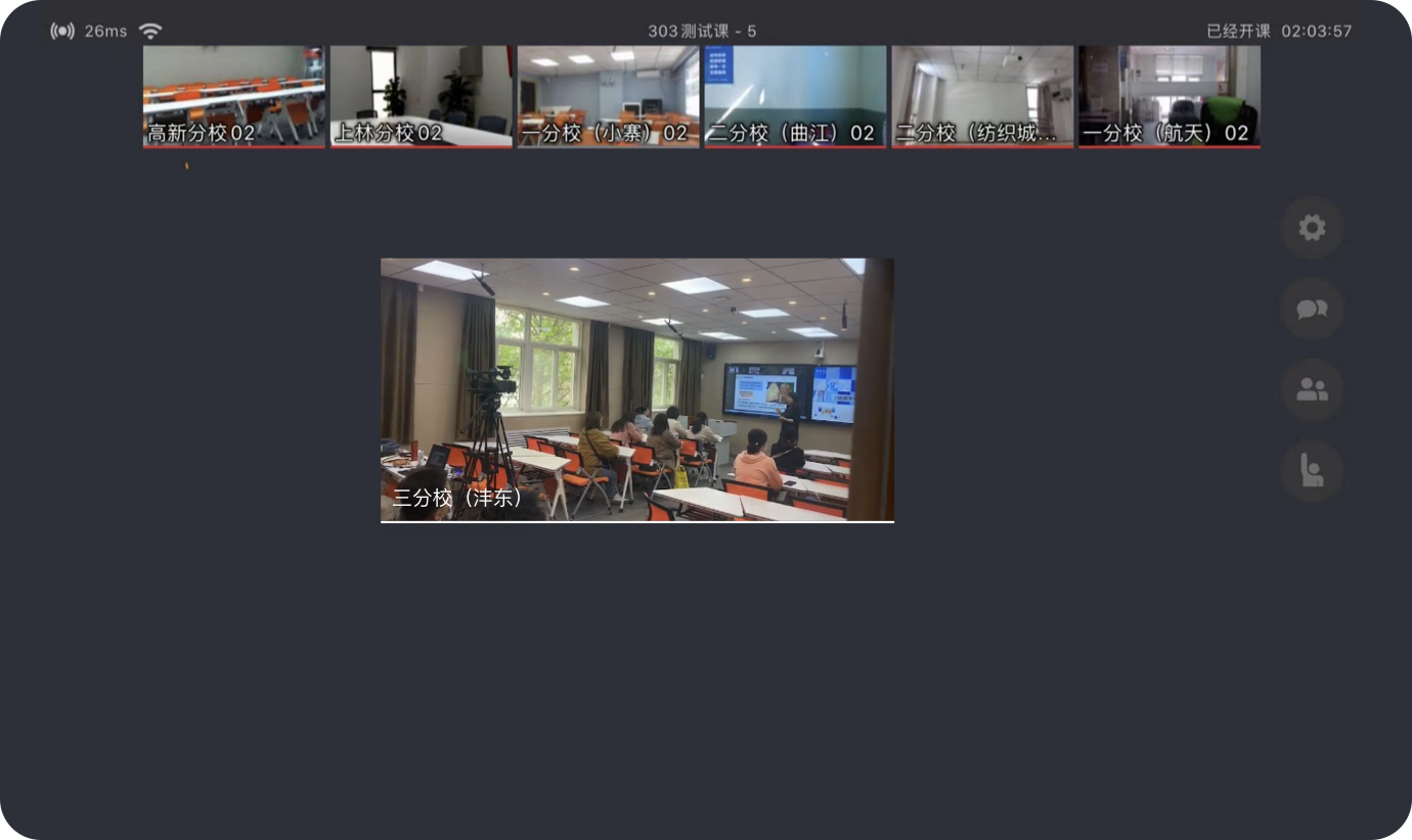 中国海洋大学在崂山校区、鱼山校区所有教 室全部部署 ClassIn 混合教学智慧教室方案。 实现一个老师给两个校区多间教室直播授 课。同时老师在授课时利用 ClassIn 与学生互 动,同步采集、生成的教学数据经过分析进 一步提升教学效果。